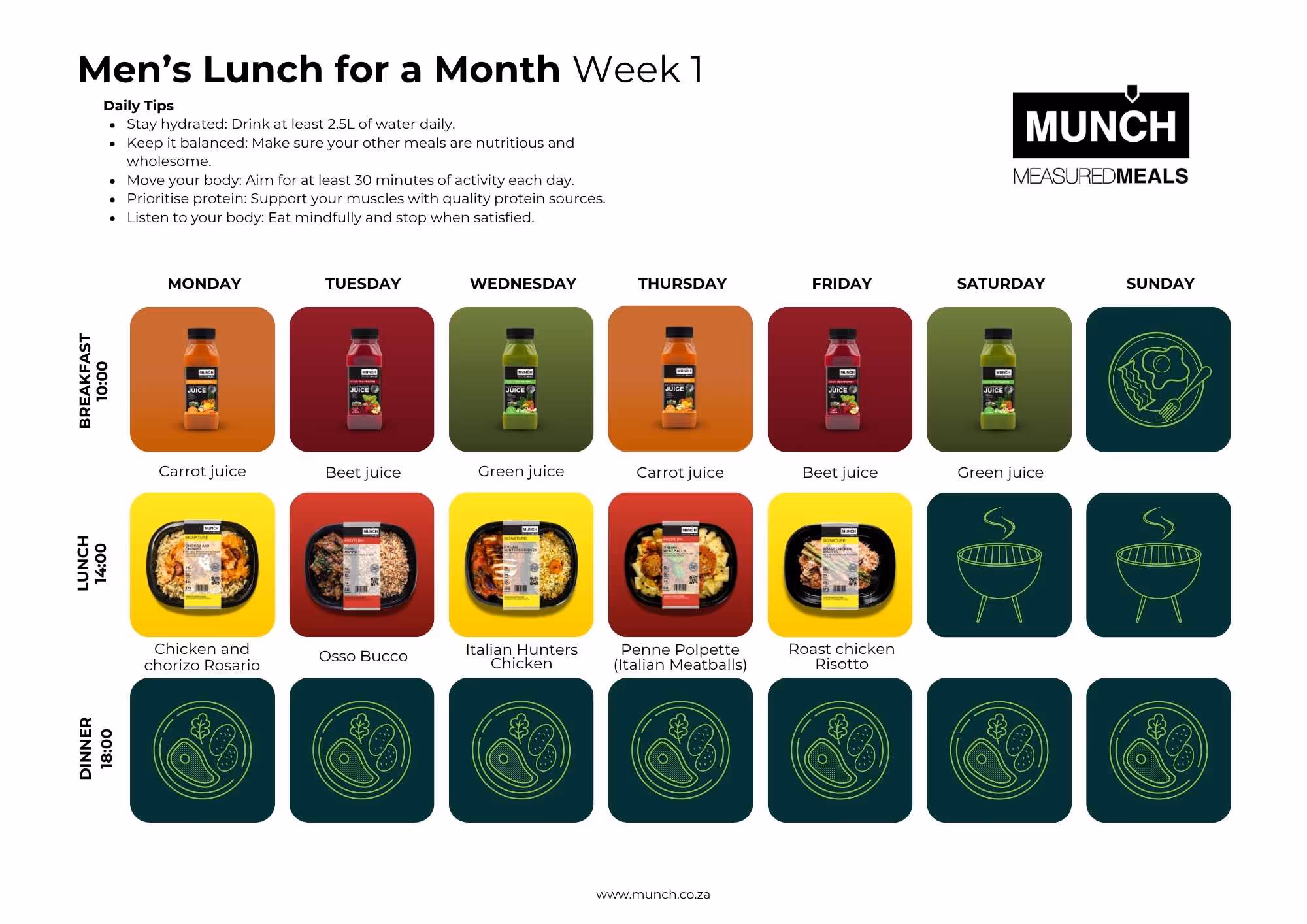 Enjoy hassle-free gourmet lunches for a month! This plan includes 22 delicious, prepped meals that are ready to go whenever you need them. You also have the option to add fresh juices, perfect for breakfast, a snack, or as a refreshing addition to your lunch. Ideal for those who want convenient, high-quality meals during the week while keeping their weekends more flexible.