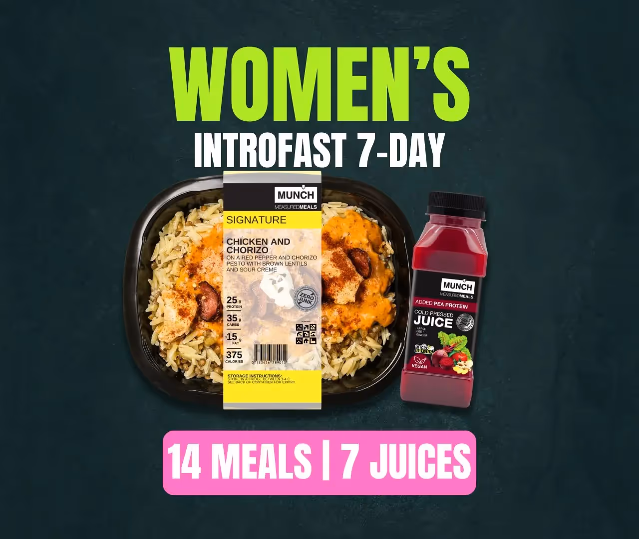Kickstart your health journey with a focused 7-day program! This plan is also perfect for those who want to give Munch a trial run, whereafter you'll be hooked! Designed for quick results, this plan combines nutrient-packed juices for breakfast and gourmet, calorie-calculated meals for lunch and dinner. Enjoy a structured approach to clean eating, with daily allowances for fruits, hydration, and exercise. Perfect for resetting your routine and boosting energy in just one week!